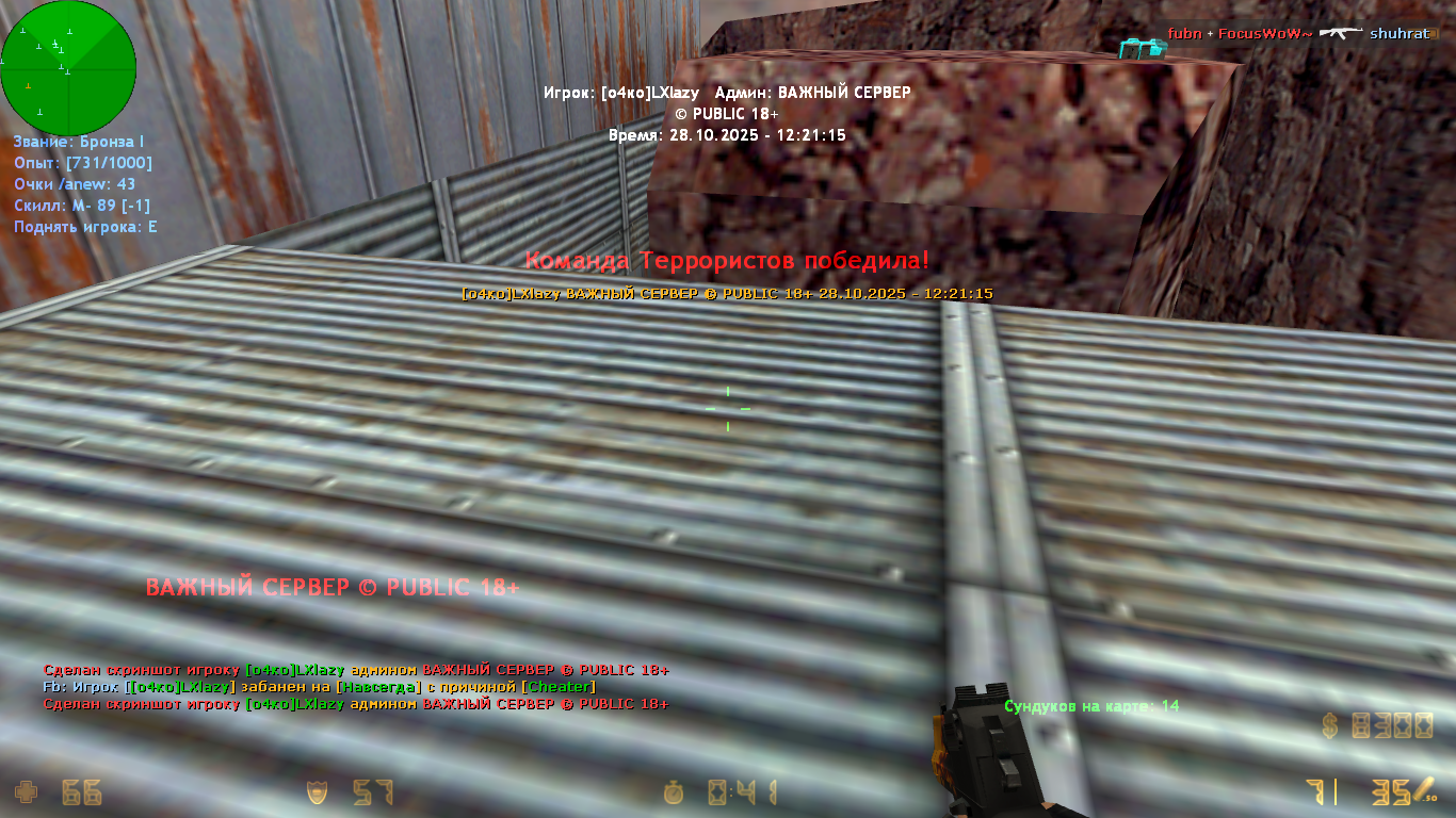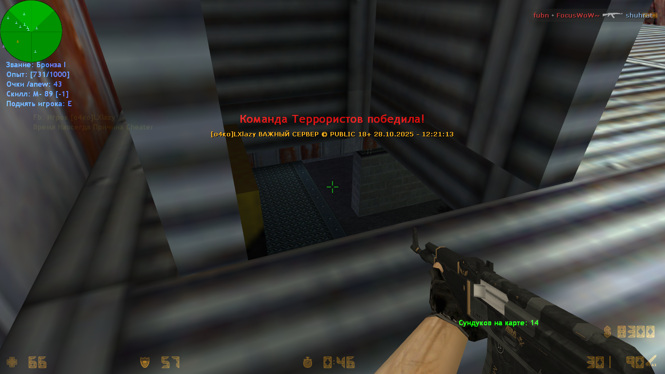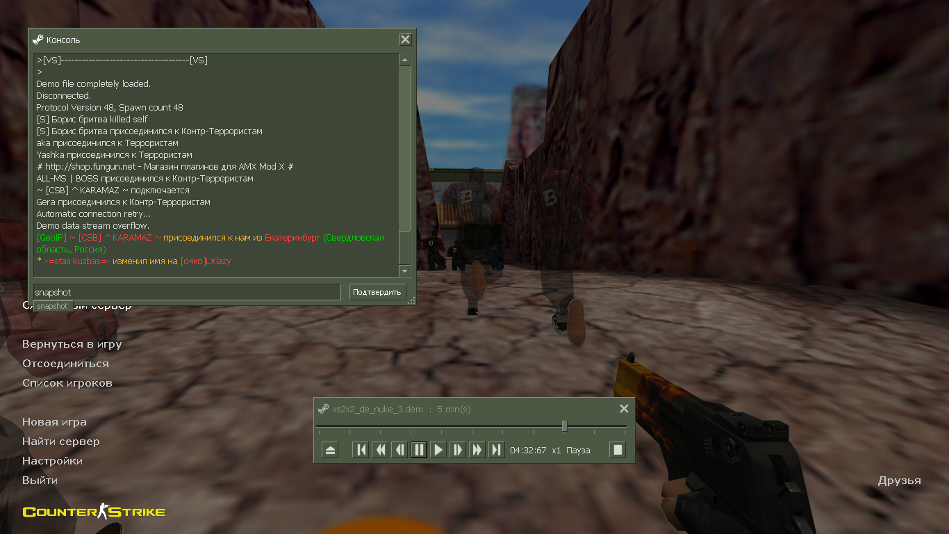 я играл на серваке и тут один игрок поменял свой ник на мой и начал стрелять скозь стены и меня забанили.вот доказатилбство что я без читов [фрагмент с банов в видео с названием vs2x2_1.dem]