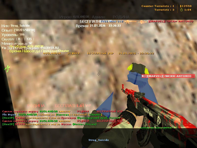 Зашел на сервер,сделал пару килов,после чего меня забанили,играл с музыкой,чат я не смотрел.