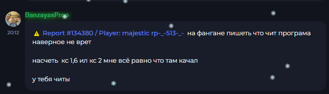 Данный администратор забанил меня за оскорбление. Я понимаю если бы это было оскорбление родных или что то личное, но я просто как факт сказал что данный админ "тупой".Да это не совсем правильно, но что поделать когда человек заходит и сразу просит демку у игрока, которую ему сразу скидывают, но наш замечательный админ не может ее скачать.(1 скрин), понимаю что наверное сложно нажать кнопку скачать.Так он еще и просишь 3 демки когда сыграл с человеком 1 карту. Так прошу отметить что админ явно не разбирается в этой игре, если до этого он забанил человека за читы из другой игры, которые даже не были запущены когда игрок проходил проверку(2 скрин), то есть если человек скачает читы на тот же майнкрафт(который так же проверяется через fungun), то его тоже забанят??, но при этом на сервере играет Император Aj с подозрительной сборкой, но почему то всем до этого нет дела)(3 скрин)